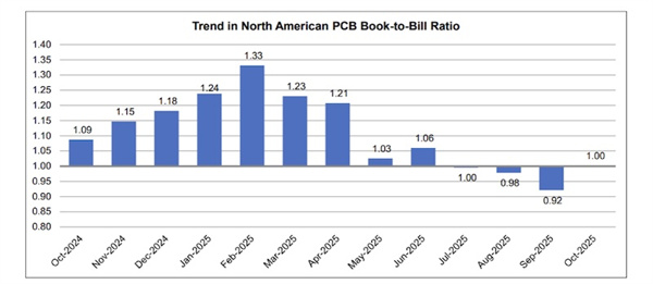 全球电子行业协会今日公布了2025年10月北美印刷电路板统计项目调查结果。当月订单出货比为1.00。2025年10月北美PCB总出货量较去年同期增长24.4%。相较前月,10月出货量增长13.5%。1-10月累计出货量同比增长11.9%。